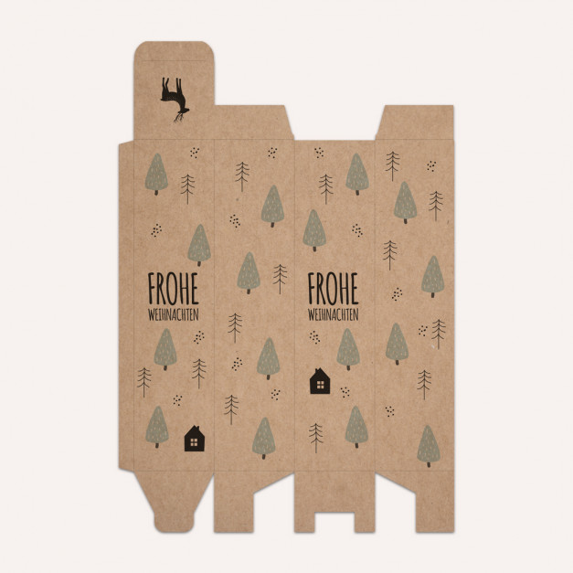 Wählen Sie einfach Ihr Lieblingsmotiv aus unseren Designs: Das Modell „Weihnachtsmann“ zeigt ebendiesen mit festlichem Ho, Ho, Ho, Geschenken und Weihnachtsbaum. Da kommt auf jeden Fall Freude auf, ebenso wie bei unserem Motiv „Oh Tannenbaum“, das etwas reduzierter gehalten ist. Das hochwertige Schwarz und satte Grün der Bäume wirkt auf dem naturbelassenen Braun unseres Kraftkartons besonders natürlich und schön. Unsere „Weihnachtssocke“ zeigt den beliebten festlichen Strumpf, die Verpackung ist ganz in weihnachtlichem Rot gehalten. Bunte Weihnachtskugeln, ein herzliches „Frohe Weihnachten“ und ein liebevoll gestalteter Christbaum mit Geschenken zieren unser Designmotiv „Weihnachtsbaum“.