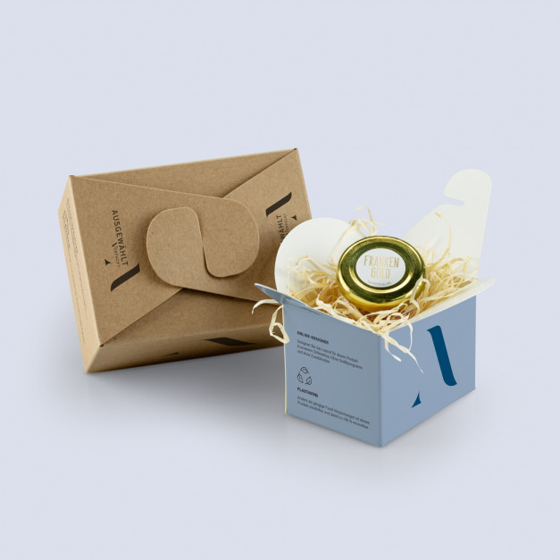 Sollten Sie planen, in Ihrer Schleifenverpackung Lebensmittel zu verpacken, empfehlen wir Ihnen unsere Geschenkverpackung für Lebensmittel, die wir aus plastikfreiem Lebensmittelkarton für Sie herstellen.